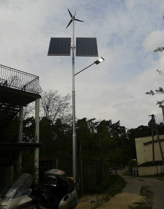 - kompletny zestaw obejmujący słup, fundament, panele, akumulator, turbinę i oprawę LED,