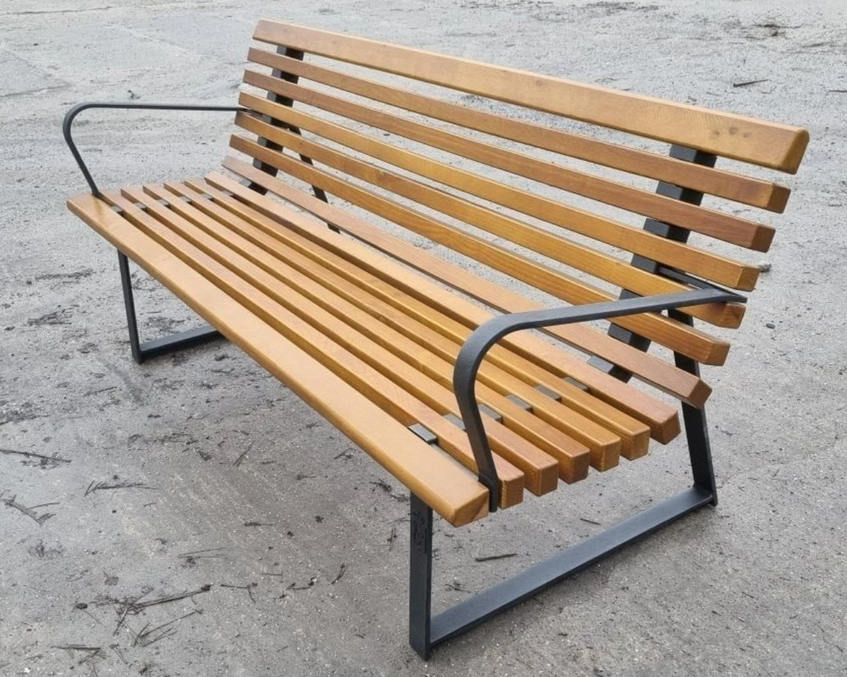 Oferta dotyczy 1 sztuki ławki stalowo-drewnianej z oparciem i podłokietnikami o długości 1800 mm.