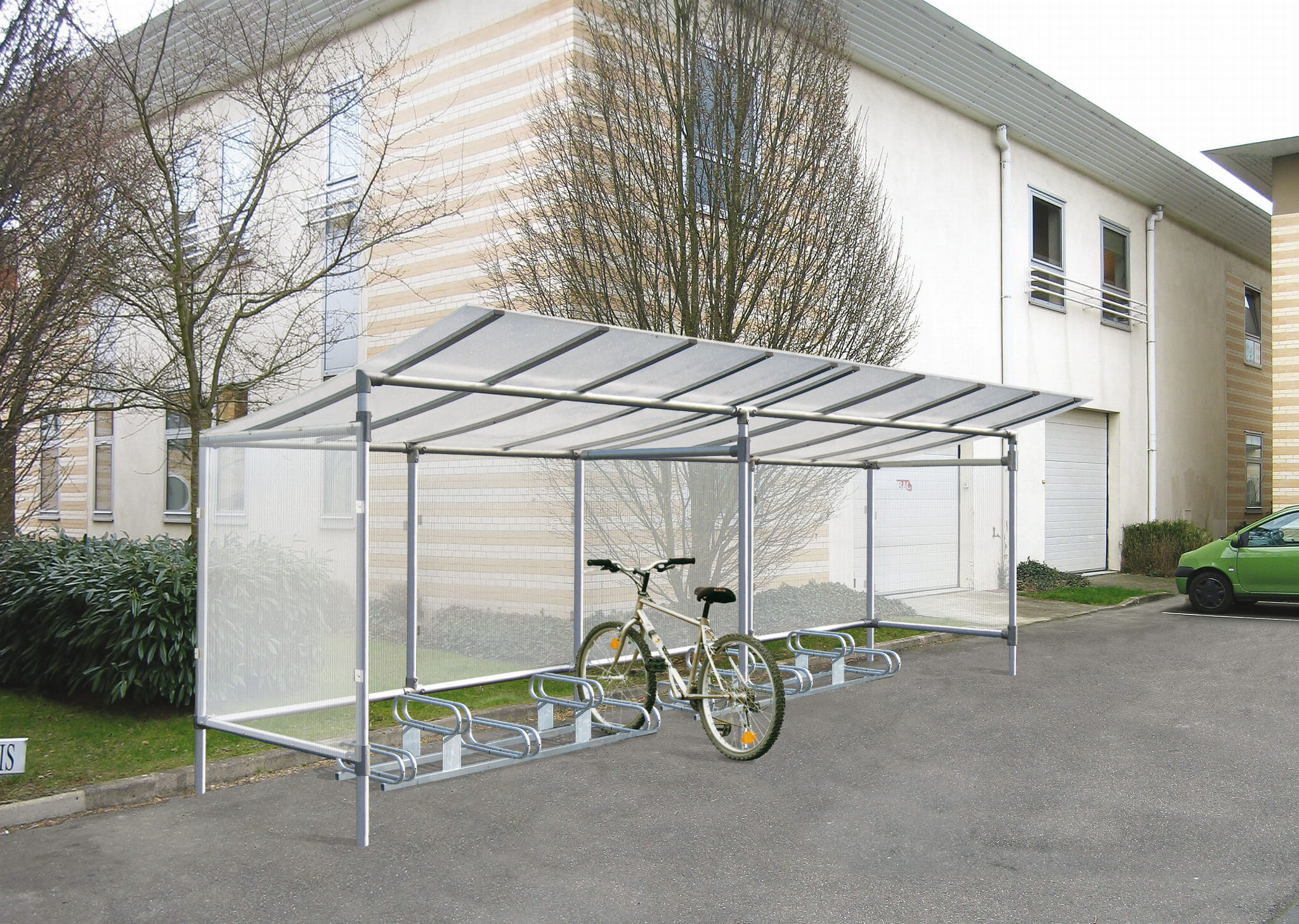 - w miejscach, gdzie potrzebna jest lekka i estetyczna wiata rowerowa dla kilku użytkowników.
