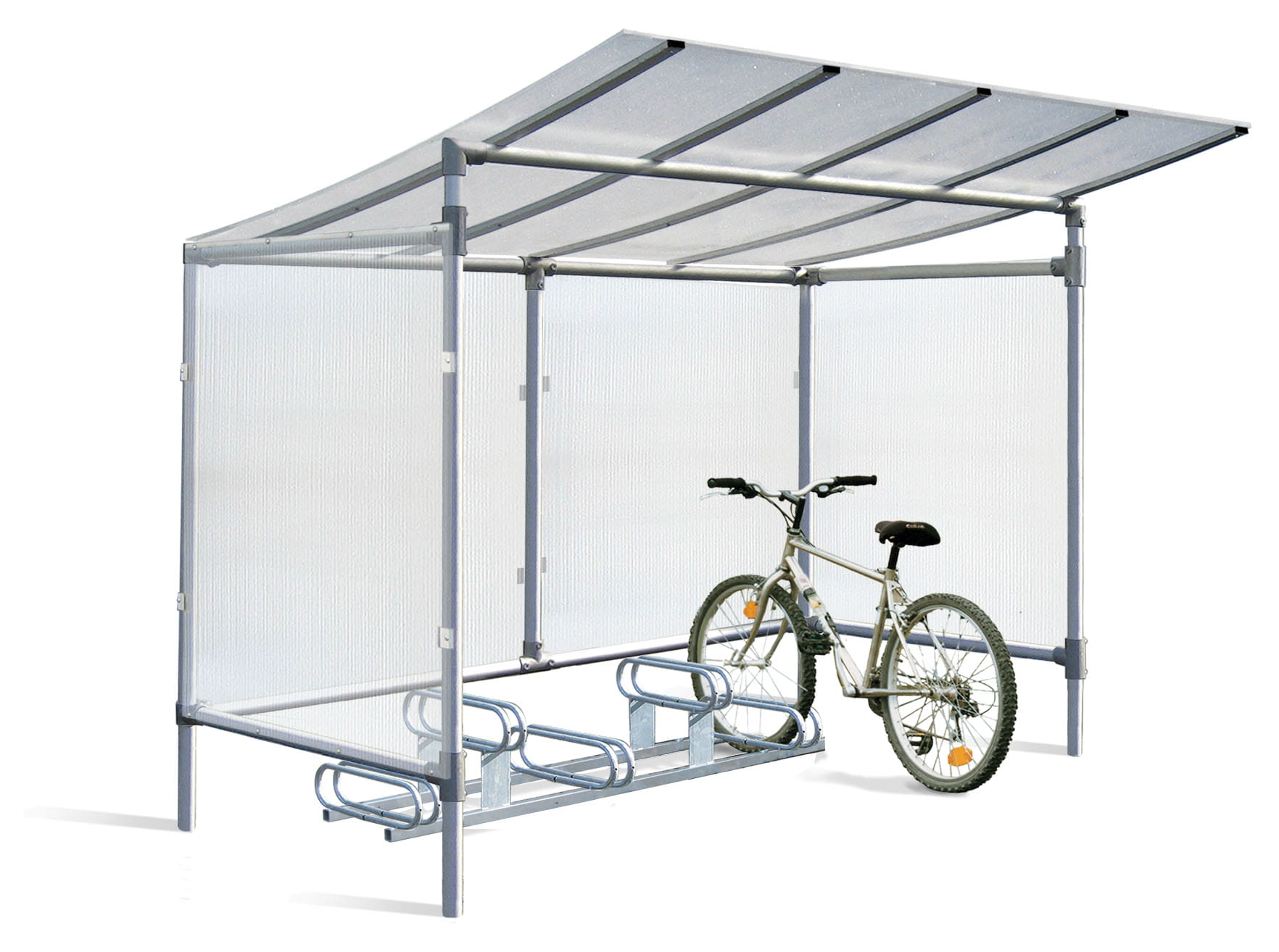 Wiata tworzy osłoniętą strefę postoju dla rowerów. Konstrukcja aluminiowa stanowi szkielet obiektu, a płyty poliwęglanowe odpowiadają za ochronę przed opadami i ograniczenie bezpośredniego wpływu warunków atmosferycznych na zaparkowane rowery. Możliwość doboru oszalowania i rozbudowy zwiększa elastyczność zastosowania.