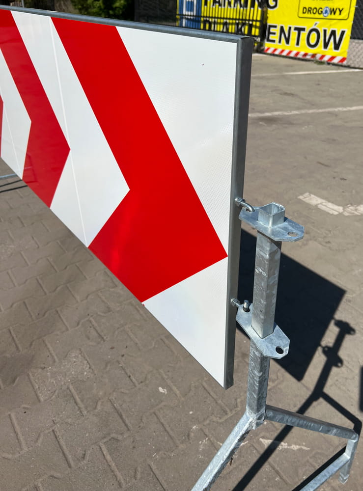 Duży format 1800×600 mm i czytelne strzały ograniczają gwałtowne korekty toru jazdy, poprawiają przewidywalność manewrów i zmniejszają ryzyko kolizji na łukach oraz w rejonie skrzyżowań typu „T”. Zestaw ze stojakami przyspiesza ustawienie oznakowania i pomaga utrzymać jego właściwą ekspozycję w trakcie robót.