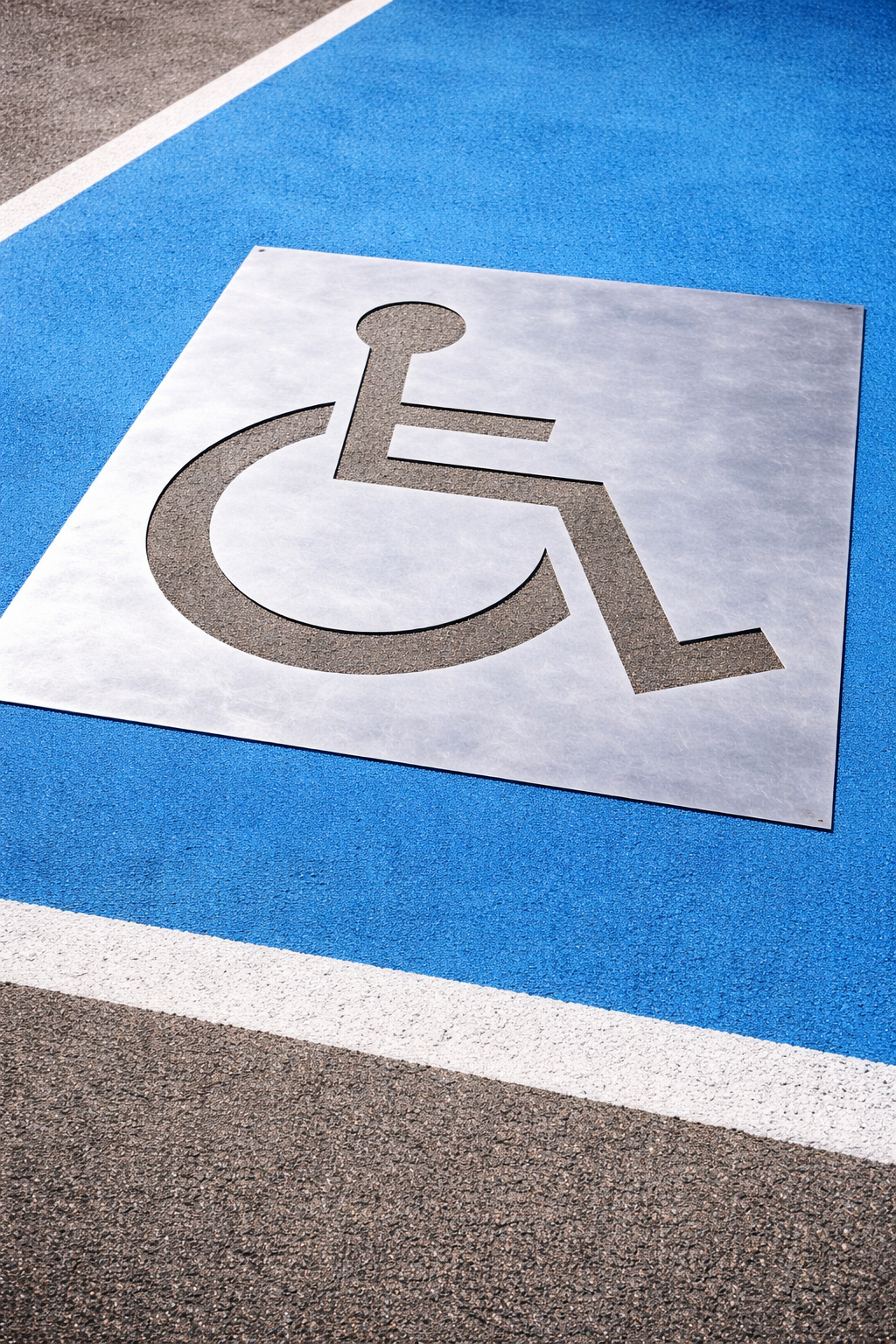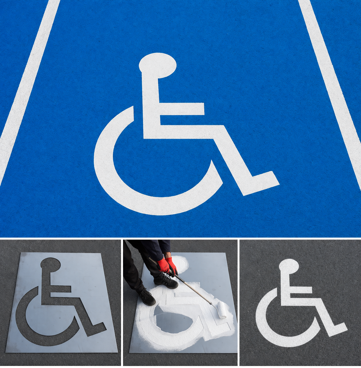 Szablon układa się bezpośrednio na nawierzchni, a następnie nanosi materiał znakujący w wycięty wzór. Dzięki stalowej formie można powtarzalnie wykonać symbol osoby niepełnosprawnej, zachowując właściwy układ oznaczenia na kolejnych stanowiskach postojowych.