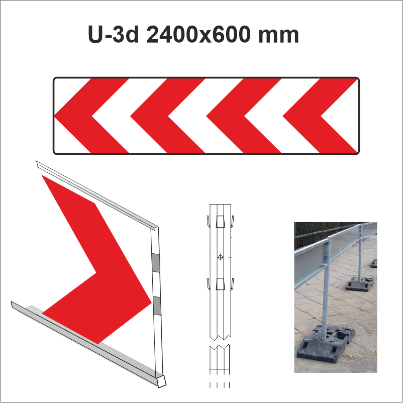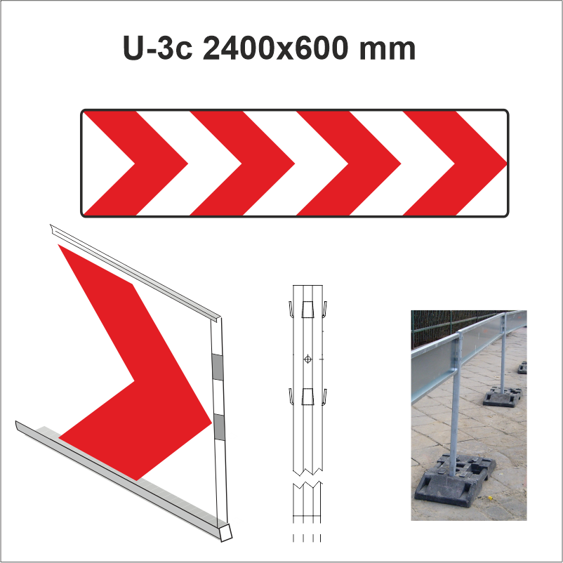 Tablica prowadząca U-3c / U-3d (ciągła) 2400×600 mm – 2 TYP (RA2), blacha ocynkowana, wersja z otworami (L-2400, 4 czerwone strzały)