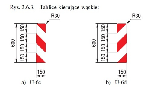 U-6c to wąska tablica kierująca przeznaczona do prowadzenia ruchu w miejscach o ograniczonej skrajni i na zwężeniach, gdzie klasyczne, szerokie tablice byłyby zbyt „masywne” przestrzennie. Stosuje się ją w ciągach prowadzenia m.in. w tunelach, na wąskich przejazdach i w punktach kanalizacji ruchu, gdzie kluczowa jest precyzyjna informacja o krawędzi toru jazdy.