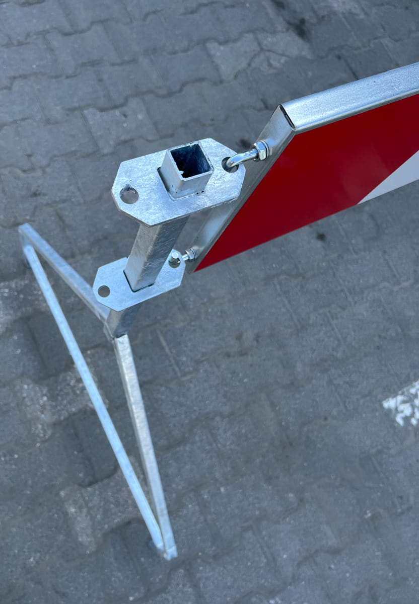 Lico zapory jest wyklejone naprzemiennie folią białą i czerwoną w klasie RA1 (1 TYP). To rozwiązanie typowe dla robót tymczasowych i wygrodzeń na drogach lokalnych oraz w obszarach o umiarkowanych prędkościach, gdzie liczy się czytelny kontrast i dobra widoczność w świetle reflektorów.