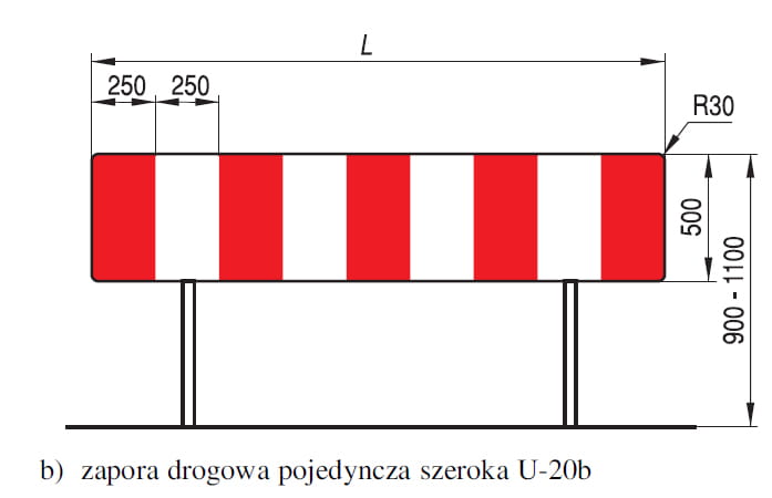Zapora U-20b jest elementem tymczasowej organizacji ruchu stosowanym do wygradzania miejsc robót w pasie drogowym oraz wykonywania wygrodzeń poprzecznych. Wariant 1250×500 mm jest wygodny przy pracach krótkoodcinkowych (chodniki, pobocza, wykopy, wloty na skrzyżowaniach) oraz tam, gdzie wygrodzenie często się przestawia wraz z postępem robót.