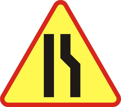 A-12b „zwężenie jezdni – prawostronne” ostrzega, że prawa strona jezdni będzie węższa niż dotychczas – np. z powodu geometrii drogi, obiektu mostowego, krawężnika, bariery, skarpy lub robót. To sygnał, by wcześniej dostosować prędkość i tor jazdy.
