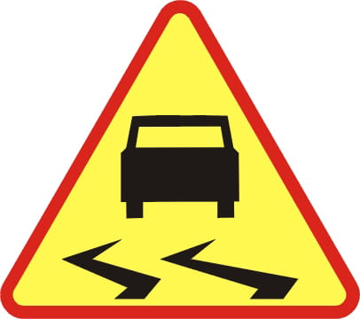 Znak ostrzegawczy A-15 służy do oznaczania odcinków o zwiększonym ryzyku poślizgu – zarówno okresowego, jak i stałego. Może to być m.in. stalowa płyta mostowa, kostka brukowa na stromych podjazdach, fragment drogi z koleinami wypełnionymi wodą, miejsca zacienione, gdzie lód utrzymuje się dłużej, a także odcinki z częstym nanoszeniem piasku, błota lub liści.