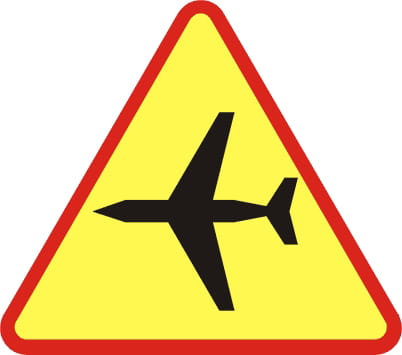 Gdy droga biegnie przy lotnisku, kierowcę potrafi zaskoczyć nagły hałas i nisko lecący statek powietrzny — ten znak ostrzega o takim miejscu z wyprzedzeniem.