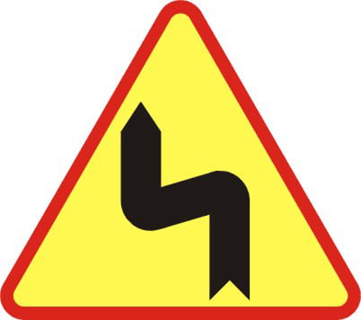 A-4 to znak ostrzegawczy, który informuje o dwóch niebezpiecznych zakrętach, przy czym pierwszy jest w lewo. Ten wariant ma rozmiar 1200 mm (wielki, W) oraz lico RA2 / 2 TYP dla wysokiej widoczności.