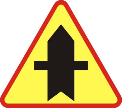 Znak A-6 „skrzyżowanie z drogą podporządkowaną występującą po obu stronach drogi”. Umieszczona pod znakiem tabliczka T-6b wskazuje układ dróg na skrzyżowaniu.