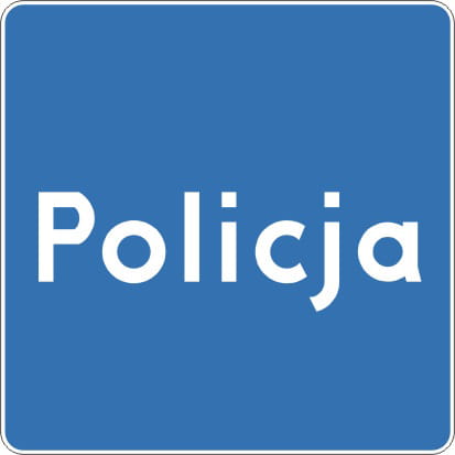 Znak wskazuje siedzibę jednostki Policji albo kierunek dojazdu do niej. Dzięki temu kierowca może wcześniej rozpoznać właściwy obiekt i odpowiednio przygotować się do skrętu, zjazdu lub zatrzymania.