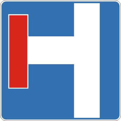 Informuje, że droga pokazana po lewej stronie układu przedstawionego na znaku nie ma przejazdu. To czytelne uprzedzenie dla kierowcy, że wskazany wlot prowadzi do ślepego odcinka.