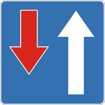Oznacza, że kierujący zbliżający się do zwężonego odcinka ma pierwszeństwo przed pojazdami nadjeżdżającymi z przeciwnego kierunku. To czytelne rozstrzygnięcie zasad przejazdu przez przewężenie jezdni.