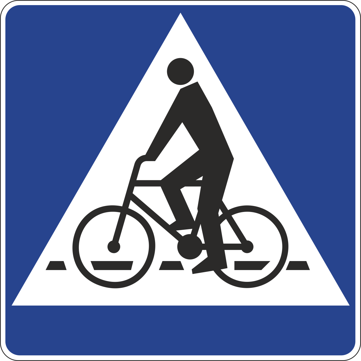 Znak D-6a oznacza przejazd dla rowerzystów, czyli miejsce, w którym ruch rowerowy przecina jezdnię lub tor ruchu pojazdów.