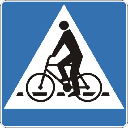 Znak D-6a oznacza przejazd dla rowerzystów, czyli miejsce, w którym ruch rowerowy przecina jezdnię lub tor ruchu pojazdów.