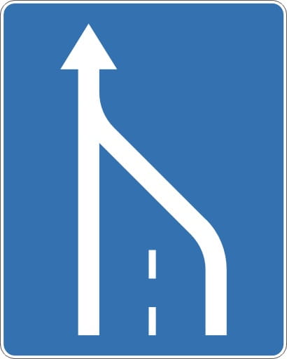 Oznacza miejsce, w którym kończy się wyznaczony pas ruchu. To czytelna informacja dla kierowcy, że powinien odpowiednio wcześnie przygotować się do kontynuowania jazdy po sąsiednim pasie lub dostosować tor jazdy do nowego układu jezdni.