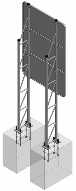 To lekka kratownica dwunożna do zabetonowania punktowego, wykonana z rur stalowych ocynkowanych ogniowo, z dodatkowym usztywnieniem z prętów stalowych. Dzięki temu dobrze sprawdza się jako nośnik tablic drogowych, tablic informacyjnych oraz tablic reklamowych w warunkach zewnętrznych.