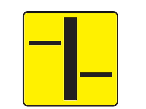 Tabliczka T-6b pokazuje rzeczywisty układ dróg na skrzyżowaniu, a przebieg drogi z pierwszeństwem oznacza linią szerszą. Dzięki temu kierowca szybciej rozpoznaje, jak biegnie droga główna i jak należy interpretować relacje przejazdu.