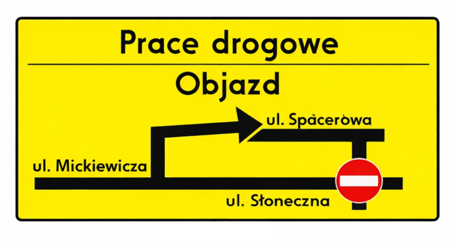 W praktyce duża tablica objazdowa ogranicza chaos w rejonie robót, poprawia przewidywalność ruchu i zmniejsza liczbę sytuacji, w których kierowca zbyt późno zauważa konieczność zmiany trasy.