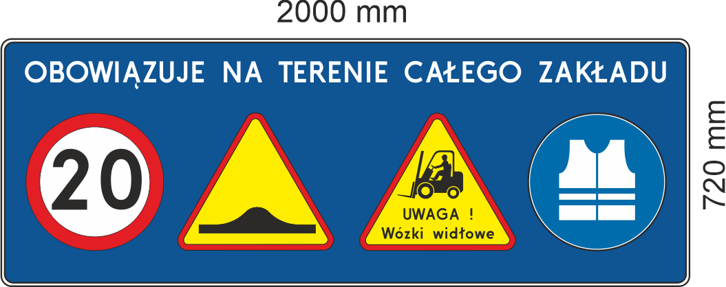 To dobre rozwiązanie wtedy, gdy tablica ma łączyć ogólny komunikat o obowiązywaniu zasad na terenie zakładu z dodatkowymi informacjami o ruchu wózków widłowych, pierwszeństwie, strefach załadunku, ograniczeniach prędkości lub zasadach BHP.