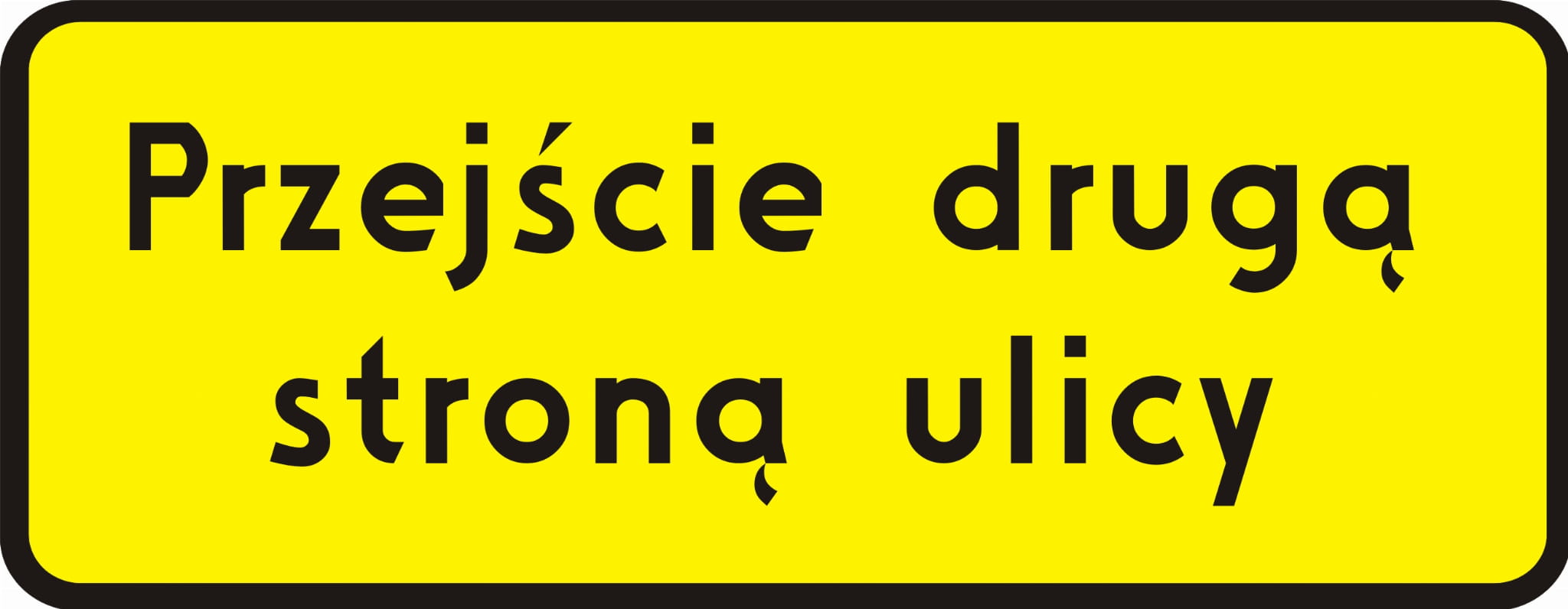 - Tablica „Przejście drugą stroną ulicy” porządkuje ruch pieszych w miejscu, gdzie dotychczasowe przejście zostało zlikwidowane lub czasowo wyłączone.