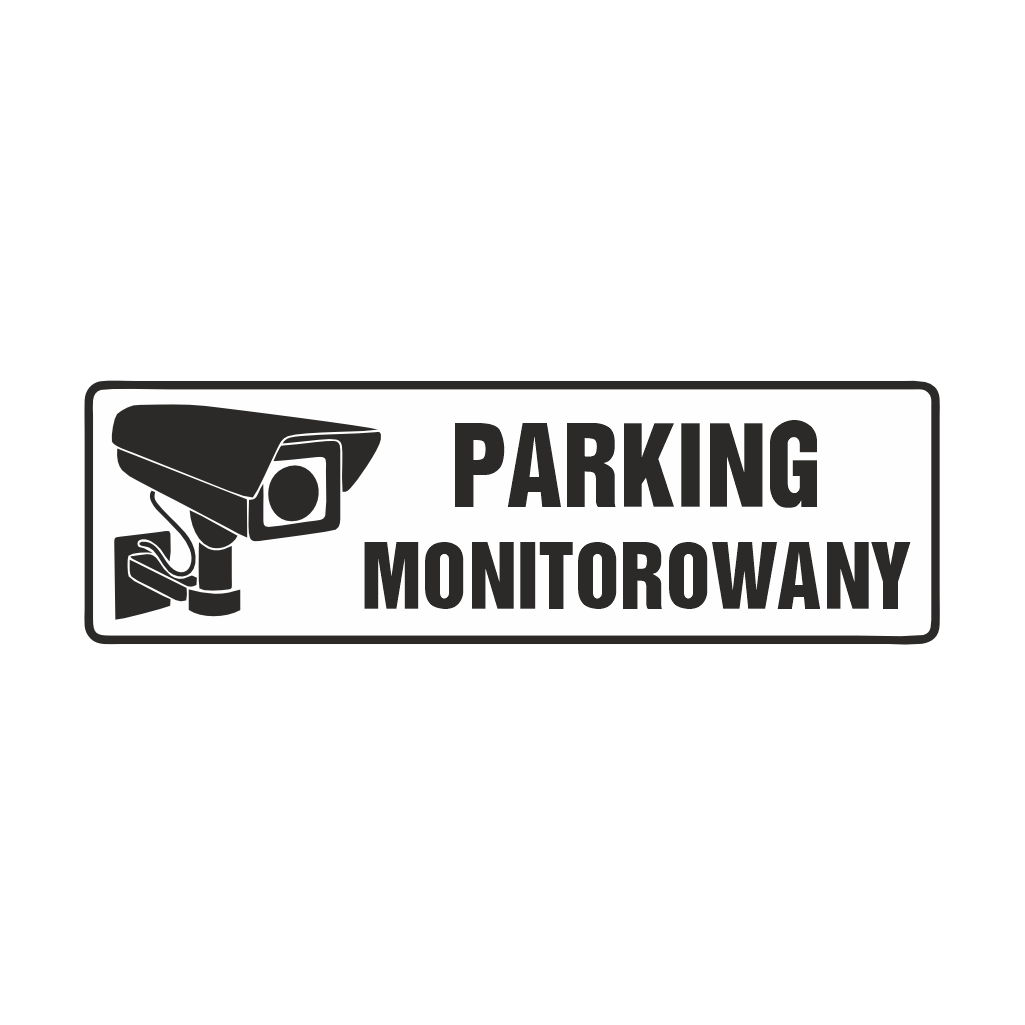 Opis: tabliczka informacyjna z nadrukiem „Parking monitorowany”, wykonana na białym tle z czarną ramką i czarną grafiką kamery, przeznaczona do montażu przy wjazdach, ogrodzeniach, elewacjach oraz w obrębie parkingów prywatnych i firmowych.