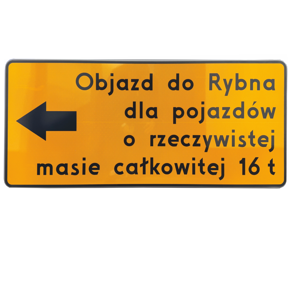 Opis: duża tabliczka podznakowa z własną treścią, wykonywana w technologii znaku drogowego, przeznaczona do oznakowania czasowego i stałego.