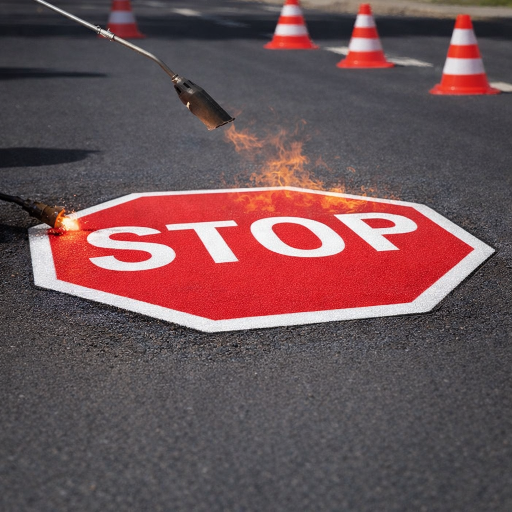 - Podgrzej znak albo piktogram palnikiem gazowym, aż materiał całkowicie się zagrzeje i zacznie się topić. Po prawidłowym związaniu z podłożem ruch drogowy można wznowić po około 30 minutach.
