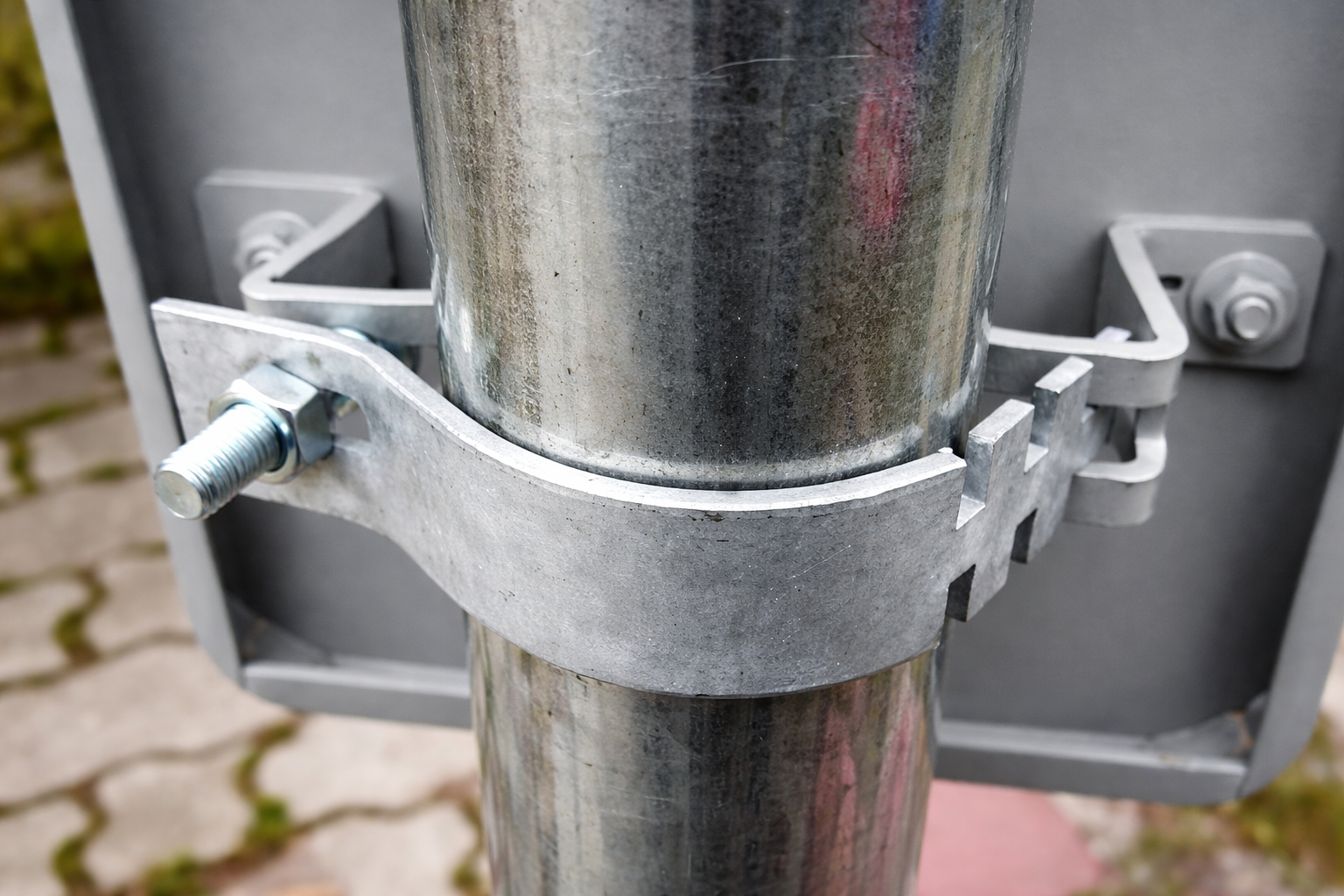 Uchwyt montażowy jest stalowym elementem zabezpieczonym przed korozją, przeznaczonym do pracy w warunkach zewnętrznych. W praktyce oznacza to większą odporność na wilgoć, opady, zabrudzenia i codzienną eksploatację w miejscach, gdzie funkcjonują znaki i tablice drogowe.