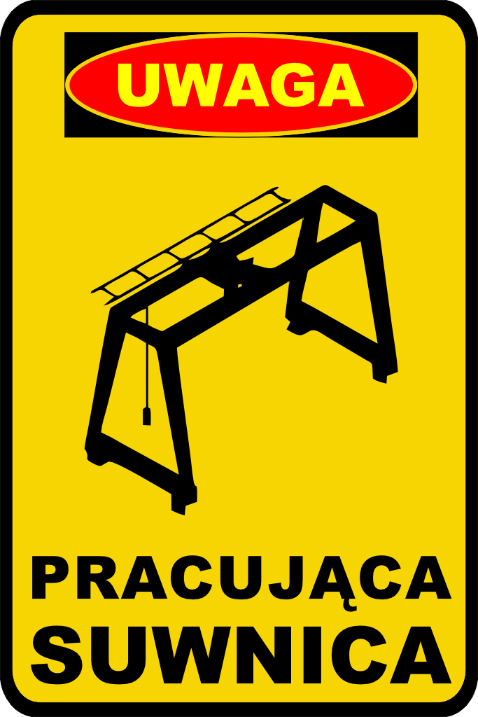 Tablica „Uwaga pracująca suwnica” informuje o pracy urządzeń transportowych nad strefą ruchu. Oznacza miejsce, w którym przemieszczane są ładunki nad głowami pracowników lub nad drogami wewnętrznymi.