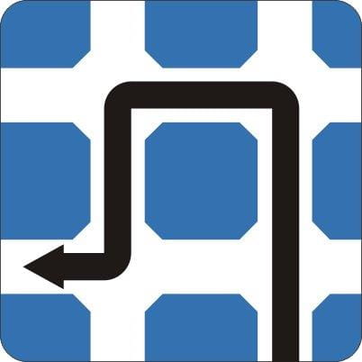 F-7 to znak uzupełniający stosowany łącznie z zakazem skrętu w lewo. Wariant F-7 _01 przedstawia konkretny przebieg objazdu, który pozwala dojechać do pożądanego kierunku inną relacją – zamiast wymuszać nielegalny lub niebezpieczny manewr. Taki znak dobrze sprawdza się na skrzyżowaniach w terenie zabudowanym, przy dojazdach do parków handlowych, magazynów, zakładów oraz w układach, gdzie ograniczenie skrętu wynika z bezpieczeństwa pieszych, geometrii wlotów lub potrzeby uspokojenia ruchu.